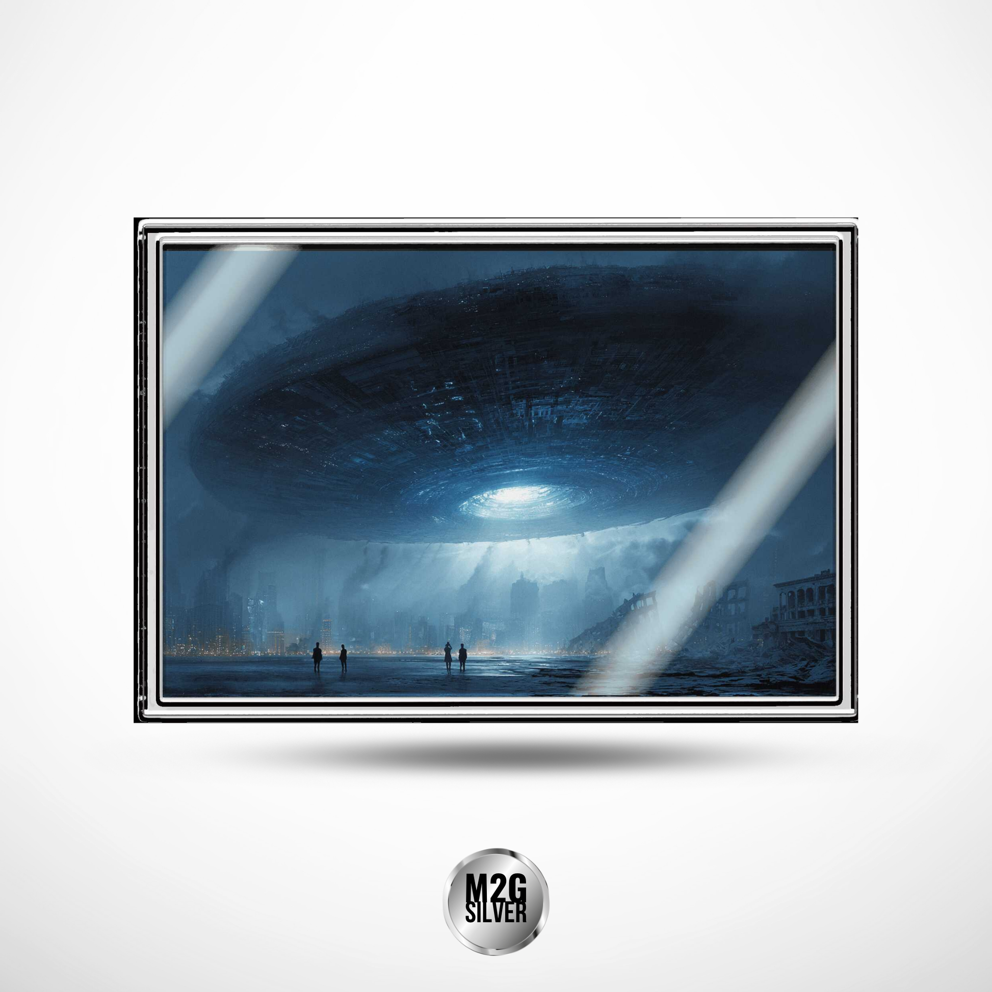 A futuristic 5g silver foil coin featuring a dramatic alien invasion scene. With vibrant colorization and a unique foil format, the Galactic Supremacy design delivers a cinematic sci-fi experience—perfect for collectors of modern and space-themed pieces.