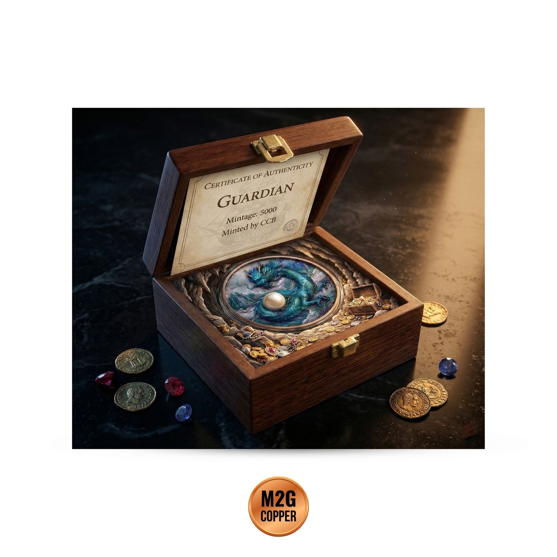 The design features the legendary Guardian Dragon, a powerful symbol of protection and ancient wisdom, as it coils around a precious pearl.