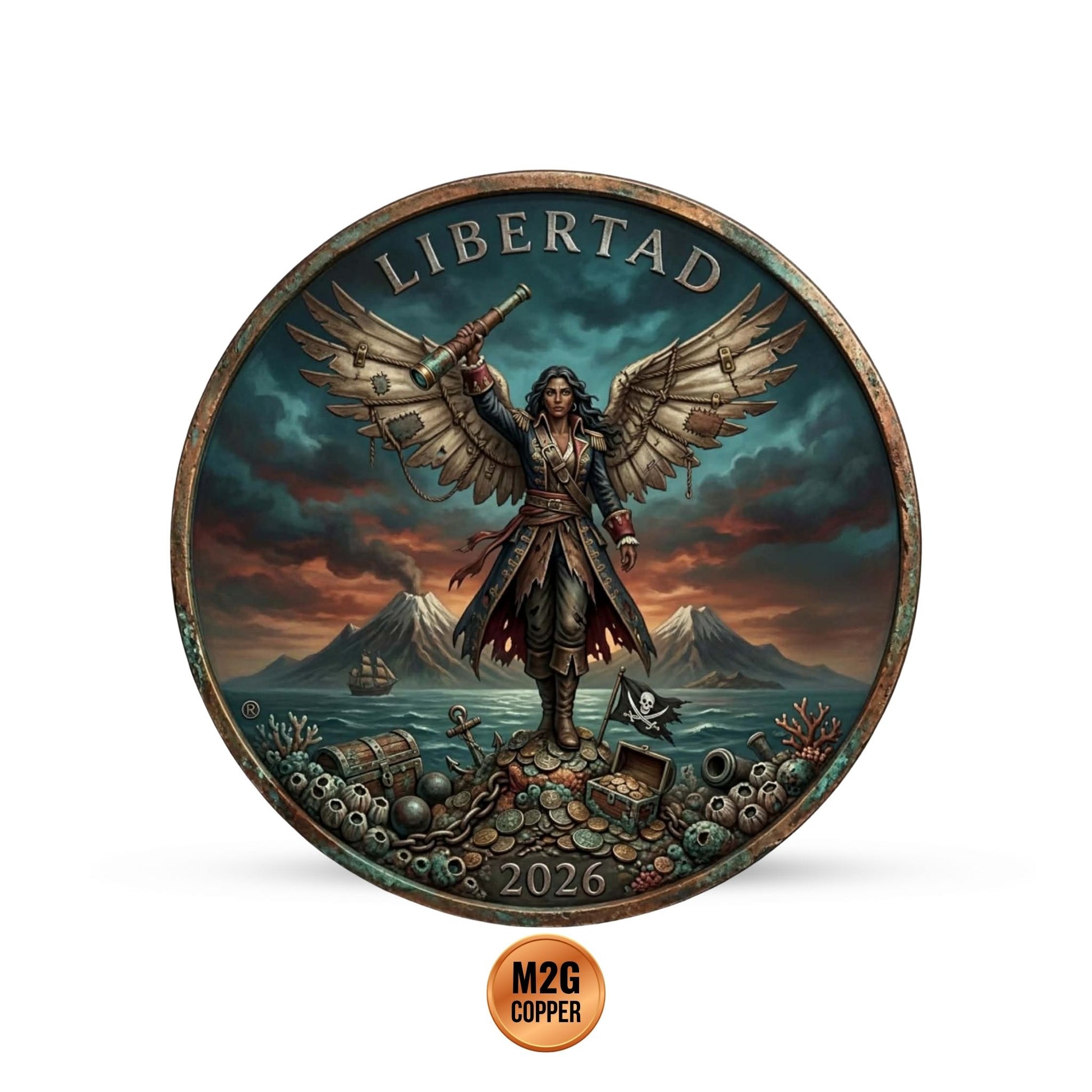 The 2026 Estados Unidos Mexicanos Libertad Doña the Pirate Angel 1 oz Copper Round offers a creative and bold interpretation of Mexico's most famous bullion design.