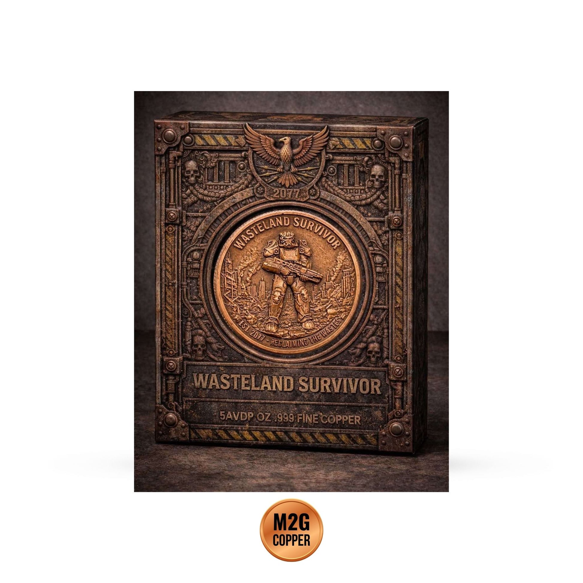 Experience the intense atmosphere of a world reborn with the Wasteland Survivor Antiqued .999 5 oz Copper Medal.